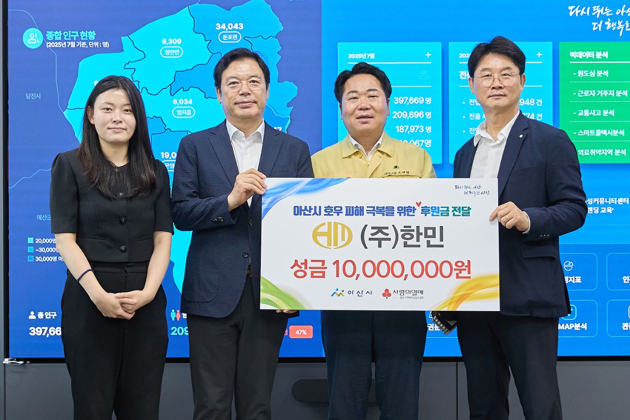 아산시(시장 오세현)는 13일 도시광산업의 선구자 ㈜한민(대표이사 김재찬)으로부터 최근 집중호우로 피해를 입은 지역 주민들을 지원을 위한 성금 1,000만 원을 후원받았다고 밝혔다.